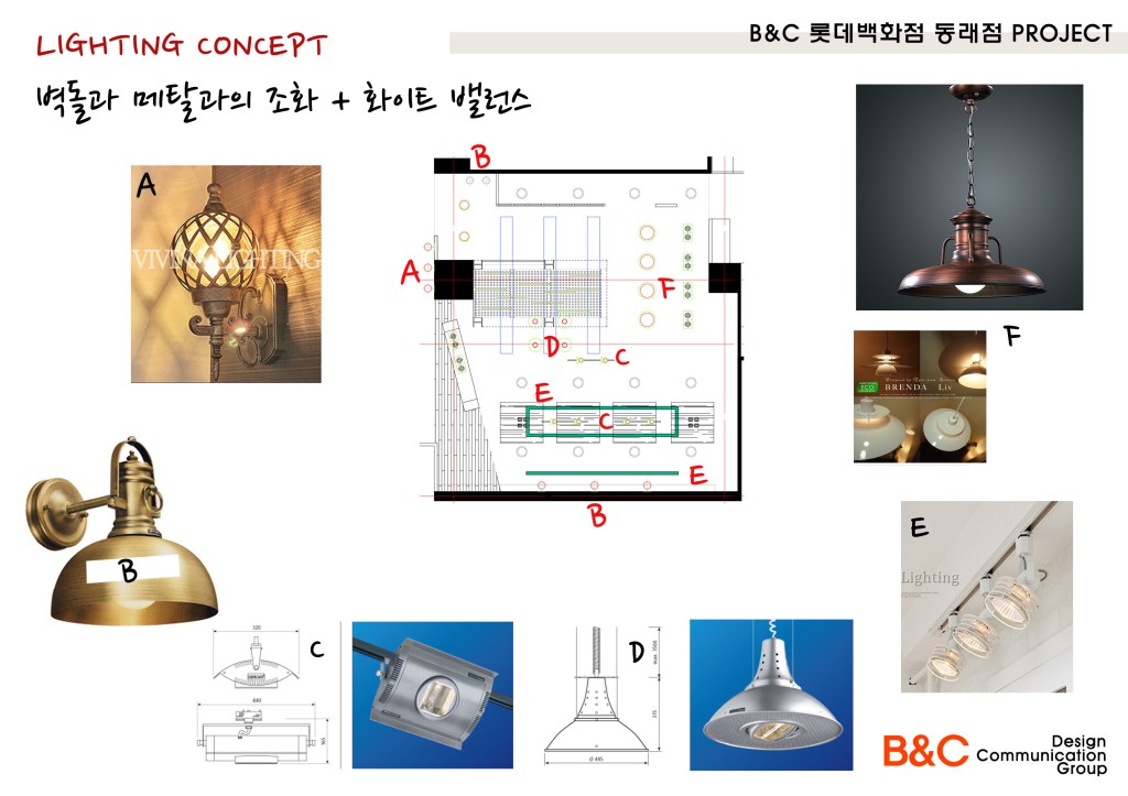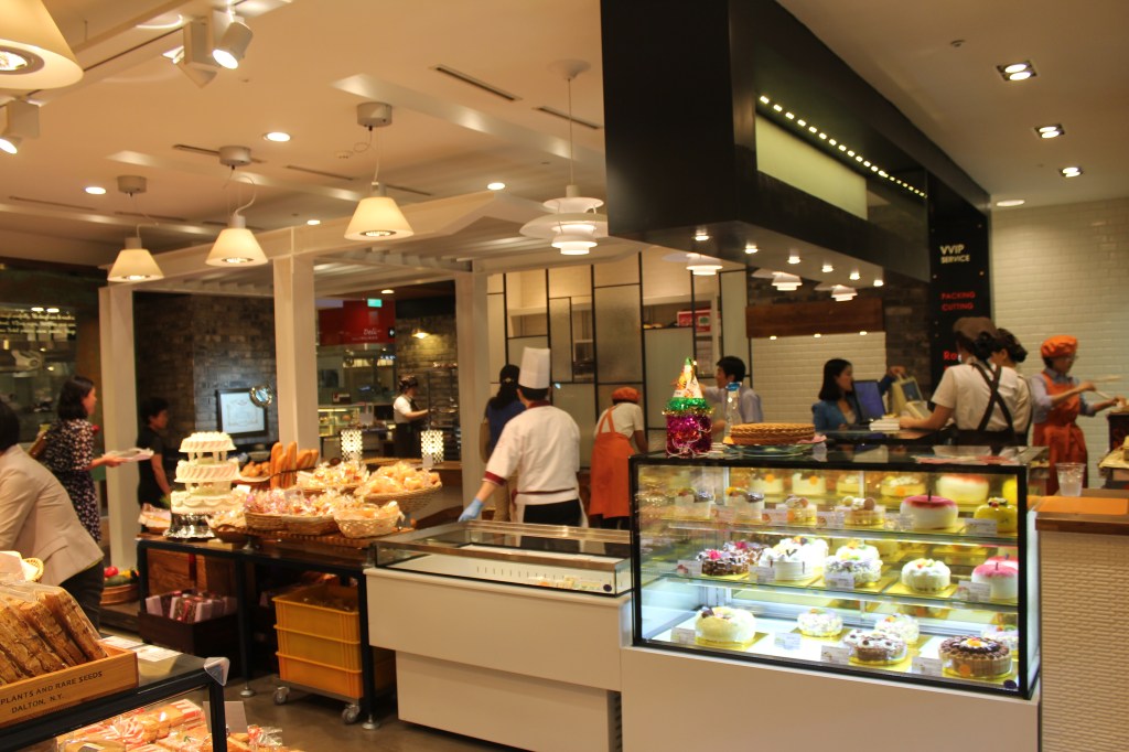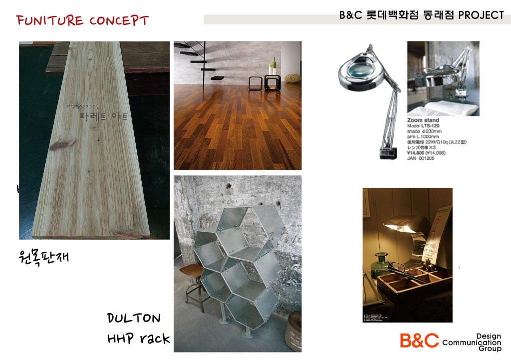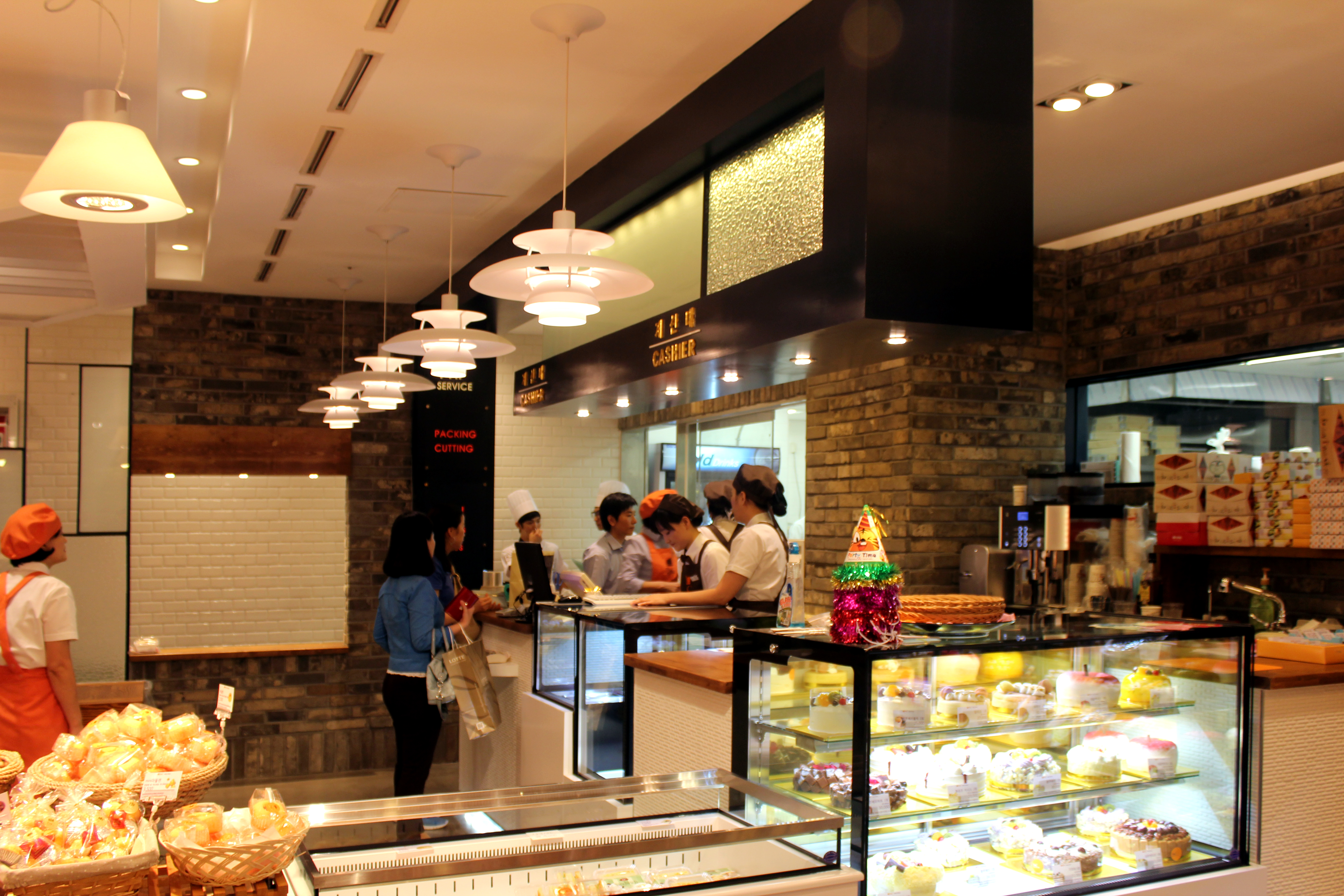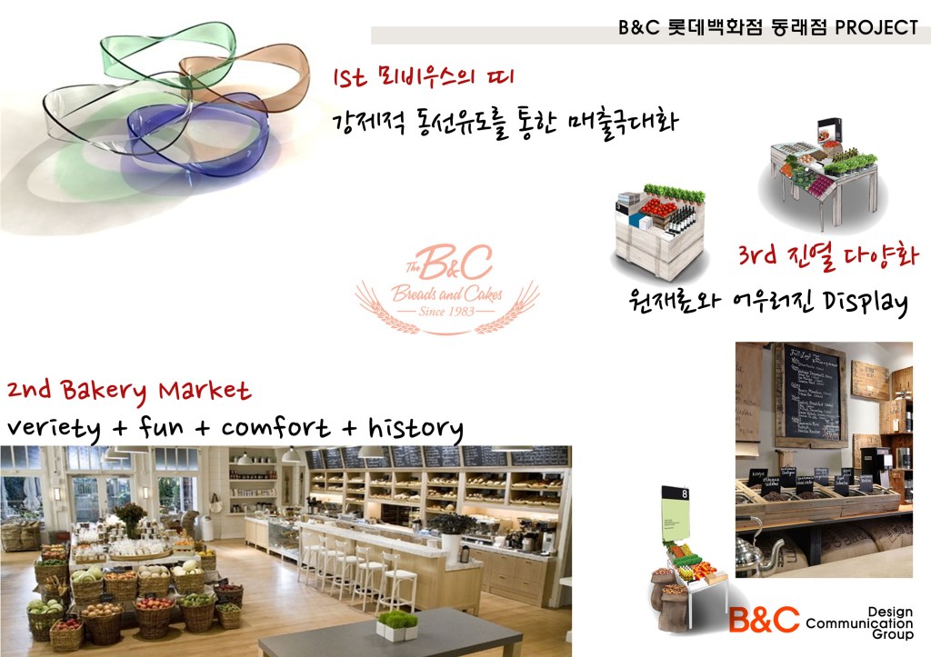 매장진열공간 60평의 다양함을 연출하려했다. 빵을 파는 시장의 진열대의 다양함과 고급스러움을 나타내고 싶었다. 단, 단조로움을 피해 단순하게 투박하지 않으면서 화사하게 복잡함을 피해 다양성을 표현하려고 힘썼다. 진열대 하나 하나 특히, 와인박스가 마음에 들지 않아 직접 만들고 도색하고 이동성을 겸비한 조그만한 가구소품을 만들고 나니 너무나 기분이 좋았다. 백화점 모든 인테리어를 보아도 철골 구조가 보이지 않아 힘들었지만 철골구조형식의 오브제는 잘 선택한것 같다.
