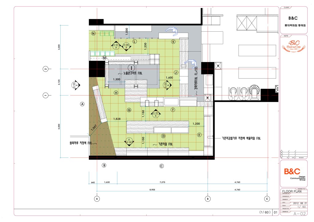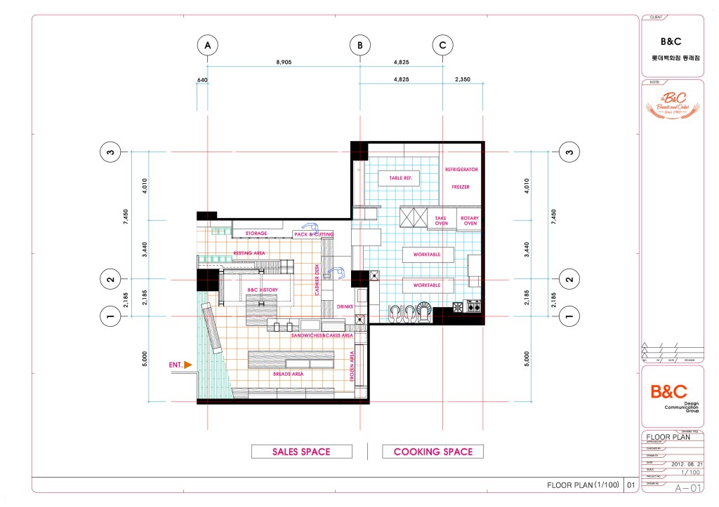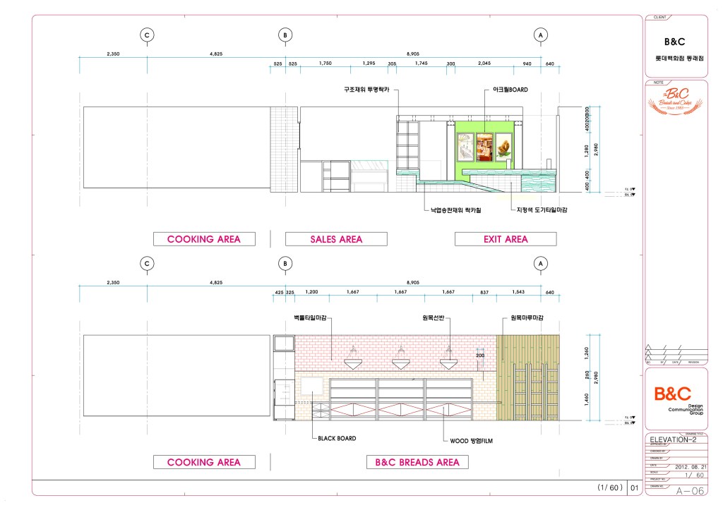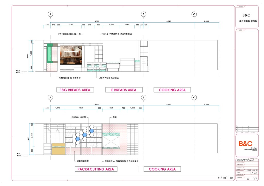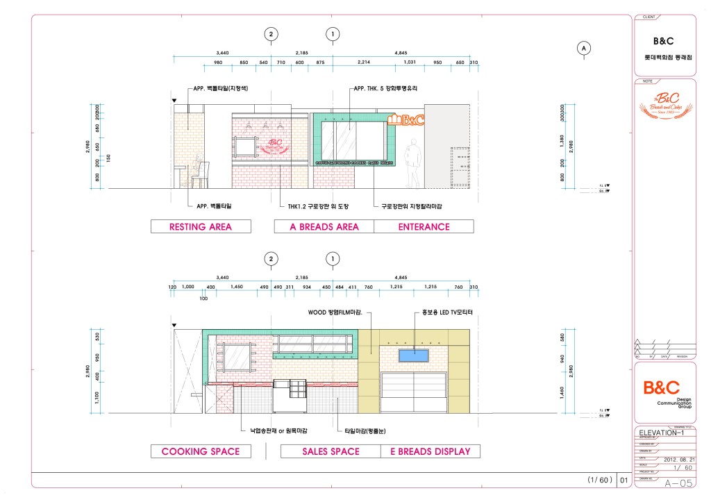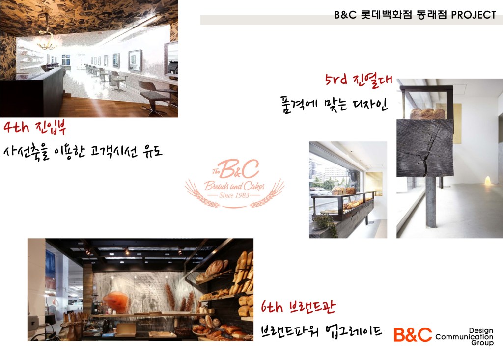 서울의 김영모제과점, 5대 제과점중 하나이다. 부산 롯데백화점 동래점 입점 인테리어공사 의뢰로 설계에서 공사까지 약6주라는 말이 안되게 진행되었던 프로젝트이다. 부산 최고의 베이커리샾을 할 수 있었던 이유는 고객의 인테리어 담당분이 백화점공사를 할 수 없다고 포기했기 때문이다. 나에겐 기회이기도 했지만 부담이기도 했다. 나 또한 롯데백화점은 처음이다. 하지만 모든일은 똑같다. 순간에 충실하면 이또한 좋게 마무리된다. 그래서 일주일만에 계획안을 만들어 백화점 담당자와 2일만에 컨펌이 끝난안이다. 식품담당자가 더 놀라더라. 어떻게 2일만에 끝나냐고.