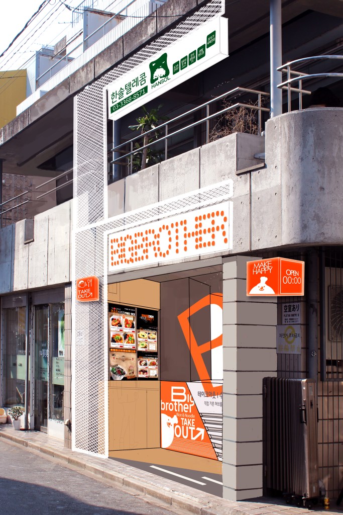 갑자기 찾아온 기회! 아직도 미완성인 빅브라더를 일본 신주쿠 신오쿠보에 런칭하시겠다고 찾아오셔서 갑자기 진행된 프로젝트이다. 일본에서 보이지 않는 까페겸 분식점은 어때야할까? 처음에는 입구측에 문이 필요없고 에어스크린을 설치하기로 했는데 바뀌어서 아쉽지만 만족한다. 도트글씨와 조광판, 내부의 접시와 같은 등기구배열 등 사람들의 이목을 끌기에 부족하진 않았다.