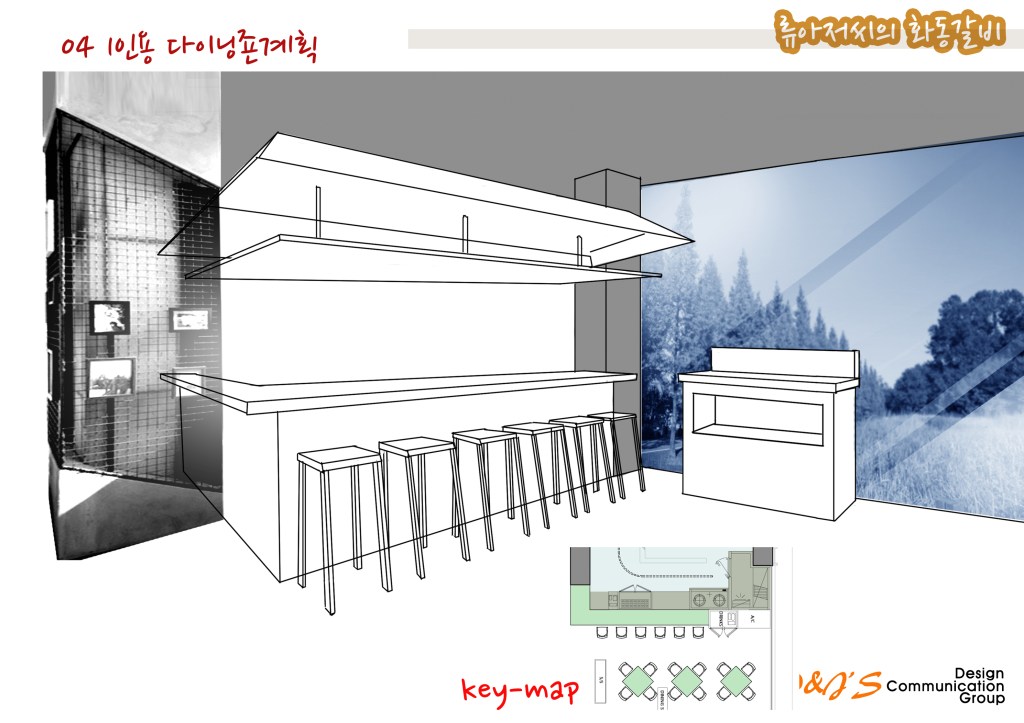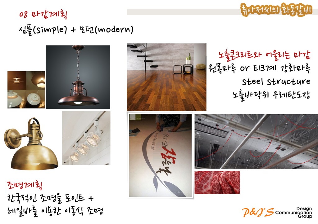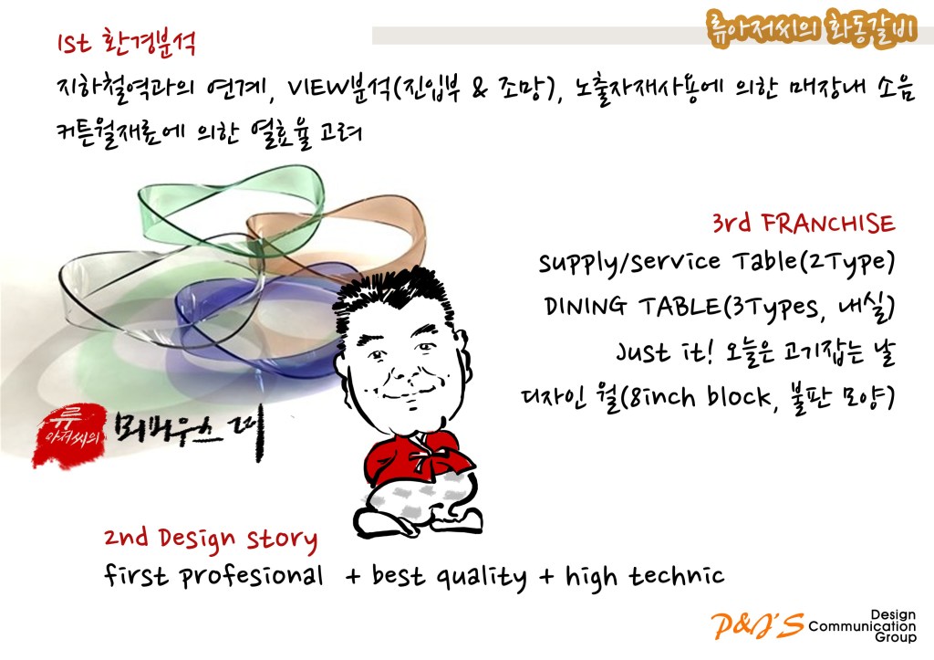 [항상 클라이언트한테 듣는 말씀] '저는 여기에 투자할 비용이 그리 많지는 않습니다' 이런 말씀보다는... 저는 고기손질만큼은 장인입니다. 우리가게의 석쇠는 식사가 끝날때까지 갈지 않아도 됩니다. 우리가게는 직장인과 주거인들이 4대6정도 됩니다. 여자고객중 40~50대를 주고객으로 생각합니다. 이렇게 접근해주는게 디자인에게는 투자비용을 줄여준다는 생각들이 정착되기를 바란다.
