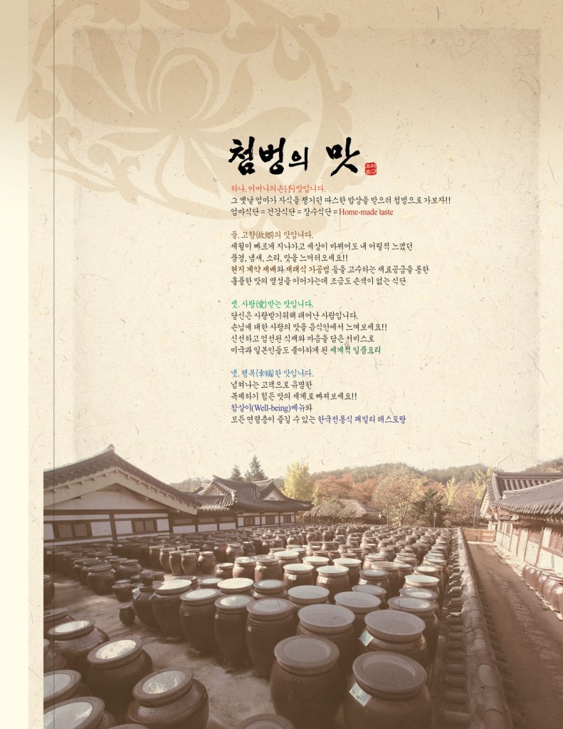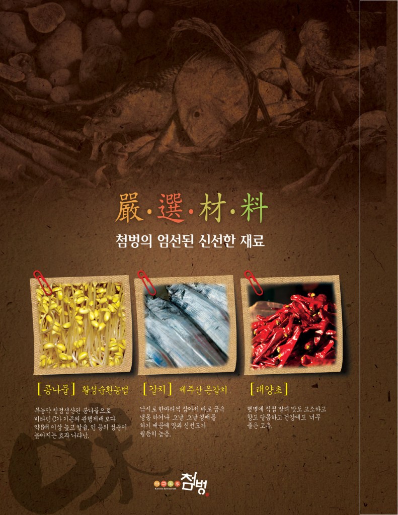 최근 외식시장은 조류독감, 광우병과 같은 문제들이 꼬리를 물고 이어지고 있습니다. 고객들의 외식 시장에 대한 불신으로 소비가 줄어들고 있습니다.음식의 맛 뿐만 아니라 ‘건강과 웰빙’의 중요성이 부각되고 있습니다. 저희 40년 전통과 역사를 자랑하는 “첨벙”은 고객님들의 건강과 행복을 위하여 엄선된 식재료 선별과 조리단계별 과정 마다 철저한 위생관리를 위하여 최선을 다하고 있습니다. 또한 “한국 외식업의 세계경영” 이라는 비전을 첨벙은 끊임없는 도전과 연구 개발을 통해 한식의 세계화를 위해 노력해 나가겠습니다. – 대표의 글 –