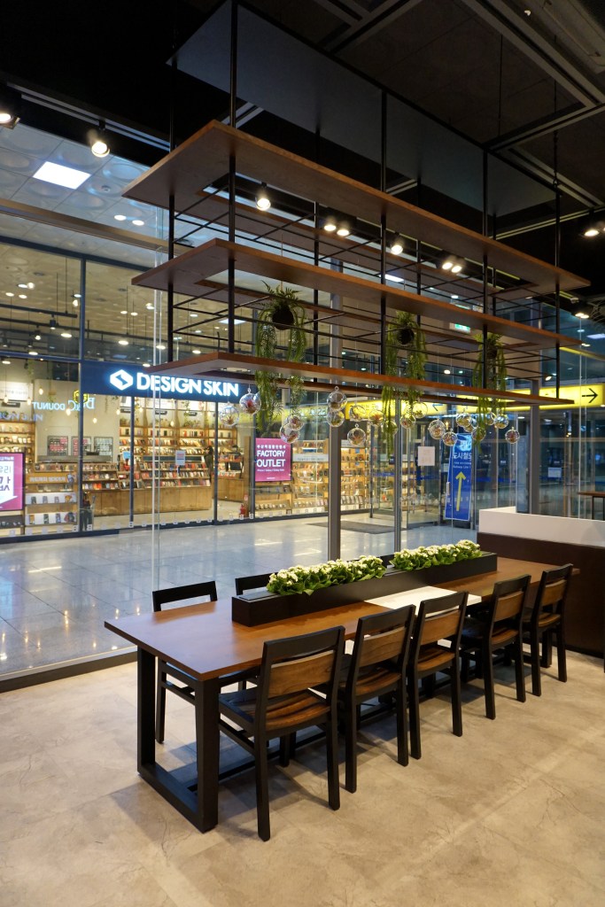 이번 프로젝트에서 신경을 많이 고려한 부분이 천장디자인이다. 천장고가 6m이상인곳이라 부산역 주변상가의 대부분이 천장고가 너무 높아서 매장이 썰렁하기도하고 천장마감의 제약때문에 기존의 마감을 그대로 노출시켜서 왠지 어색한 매장이 많이 보인다. 그래서 나중 원상복구를 감안하더라도 상부의 SMC판넬에 도장하는것을 건축주께서 동의해주셨고 코레일에서도 허락해서 매장에 맞는 색으로 도색하였고 부분마다 어울리는 구조를 천장에서부터 매달기 시작했다. 처음에는 걱정반 염려반으로 시작했지만 그래도 설계사무소에서 배웠던 구조개념을 돌이켜보면서 안정적인 구조체를 만들기 위해서 많은 노력을 하였고 또한 현장 경험이 많은 파트장들과 계속 논의하면서 만들어갔다. 너무나 재미있었던 프로젝트중의 하나이다.