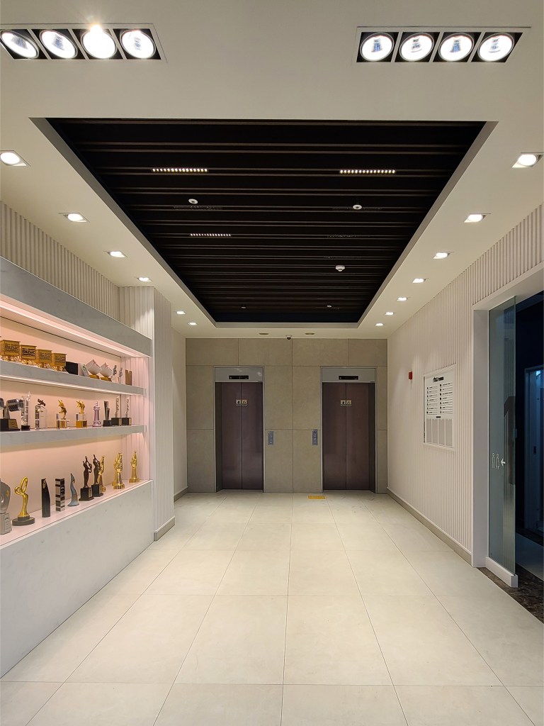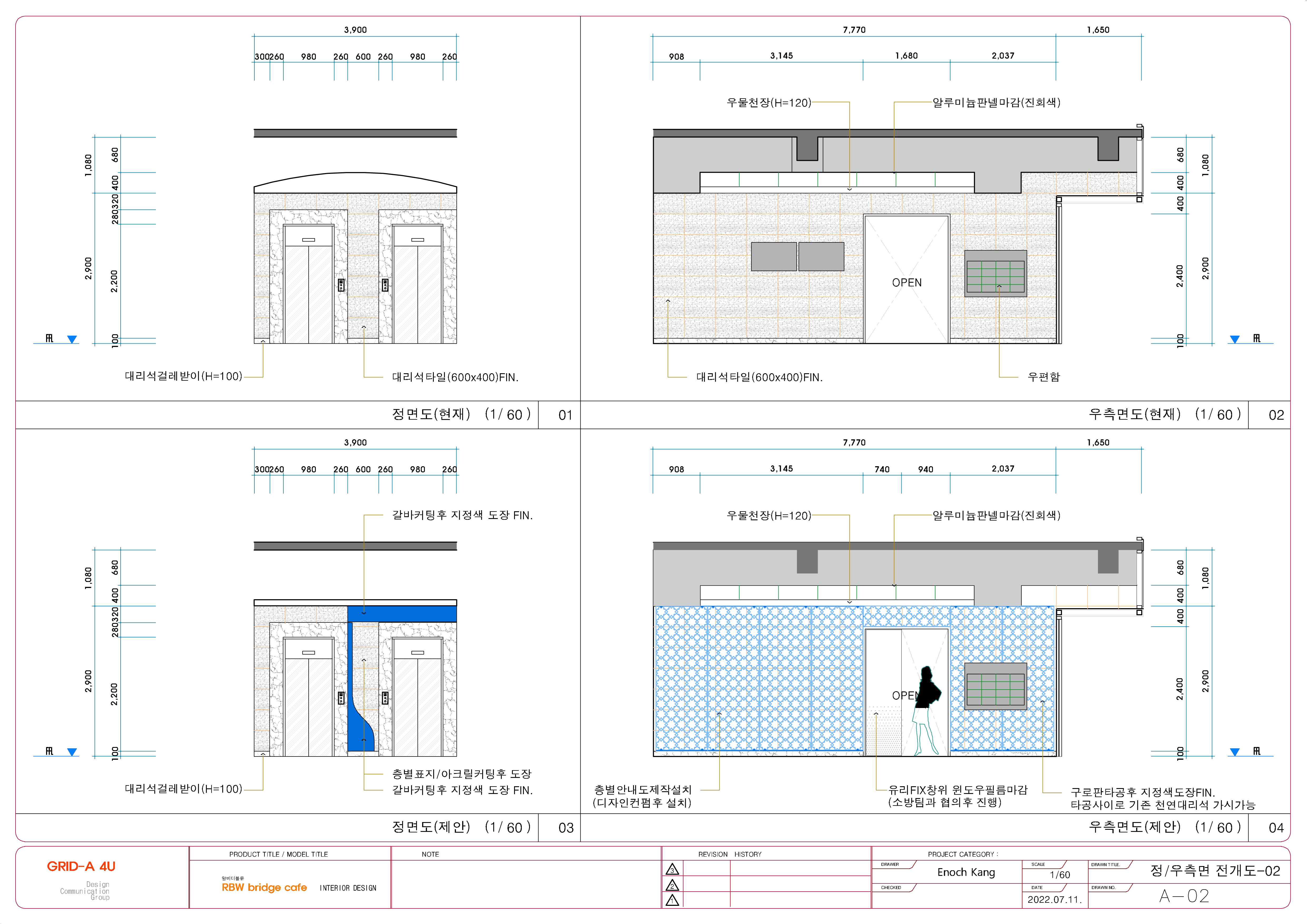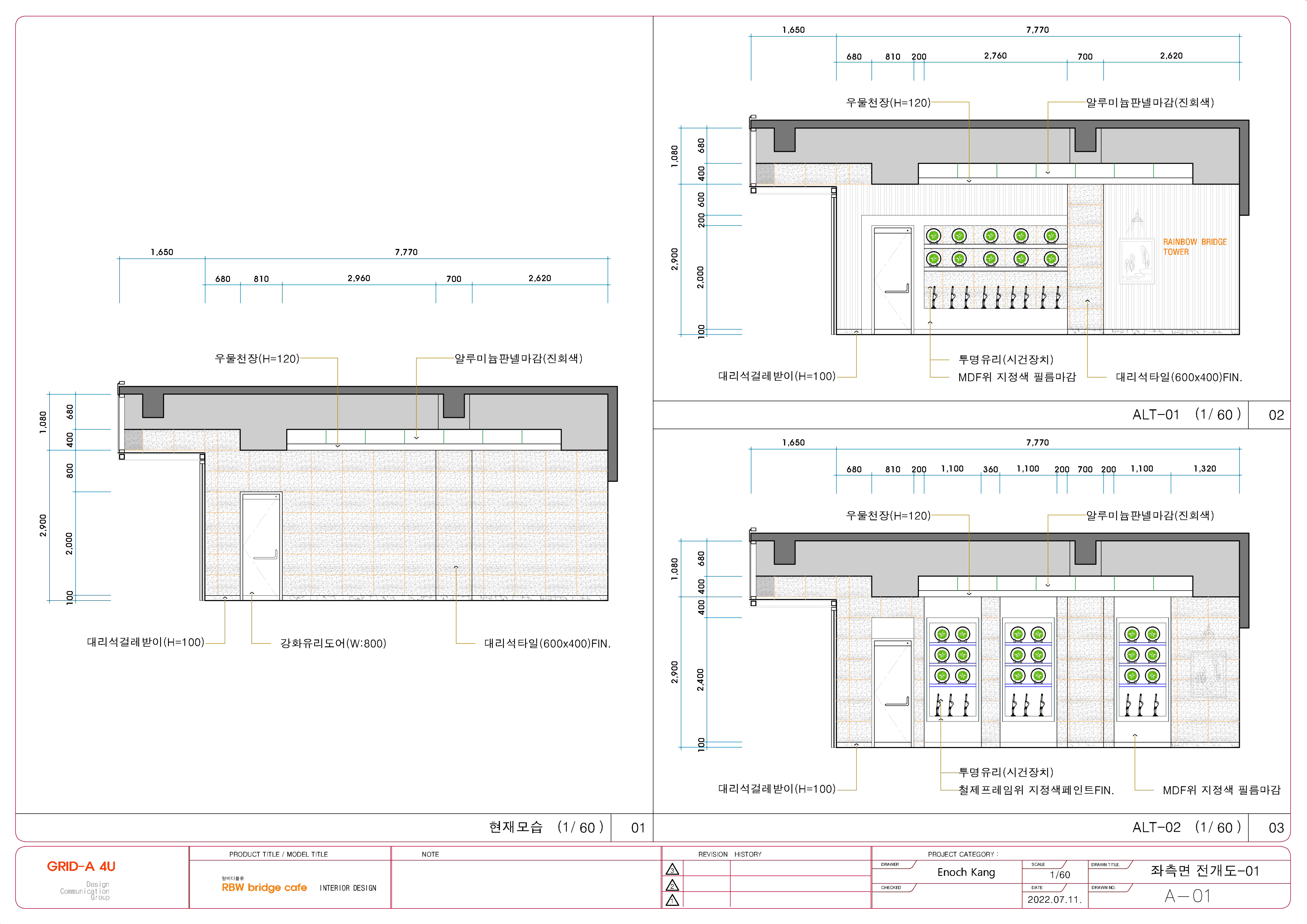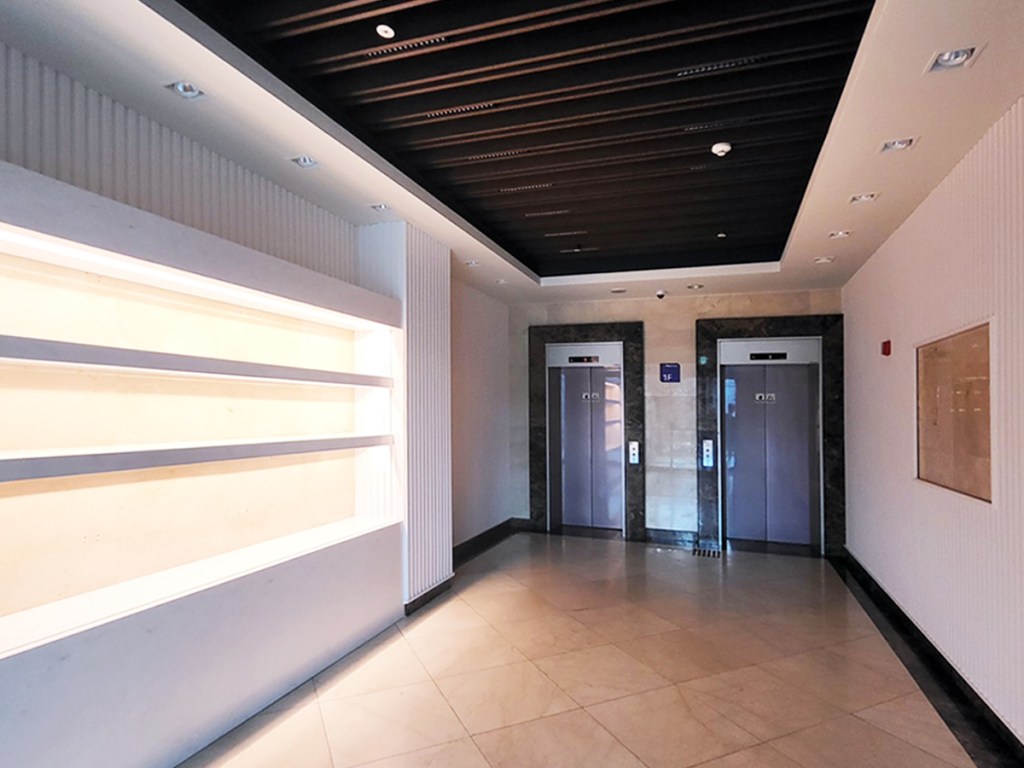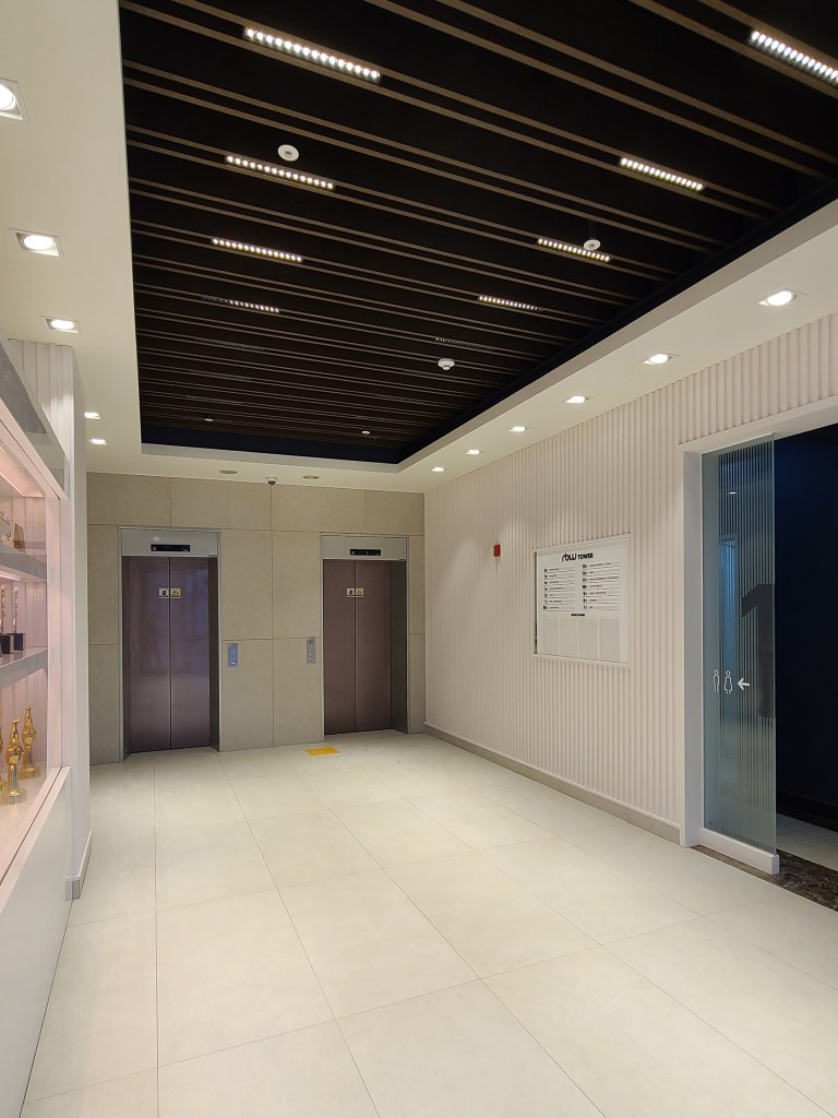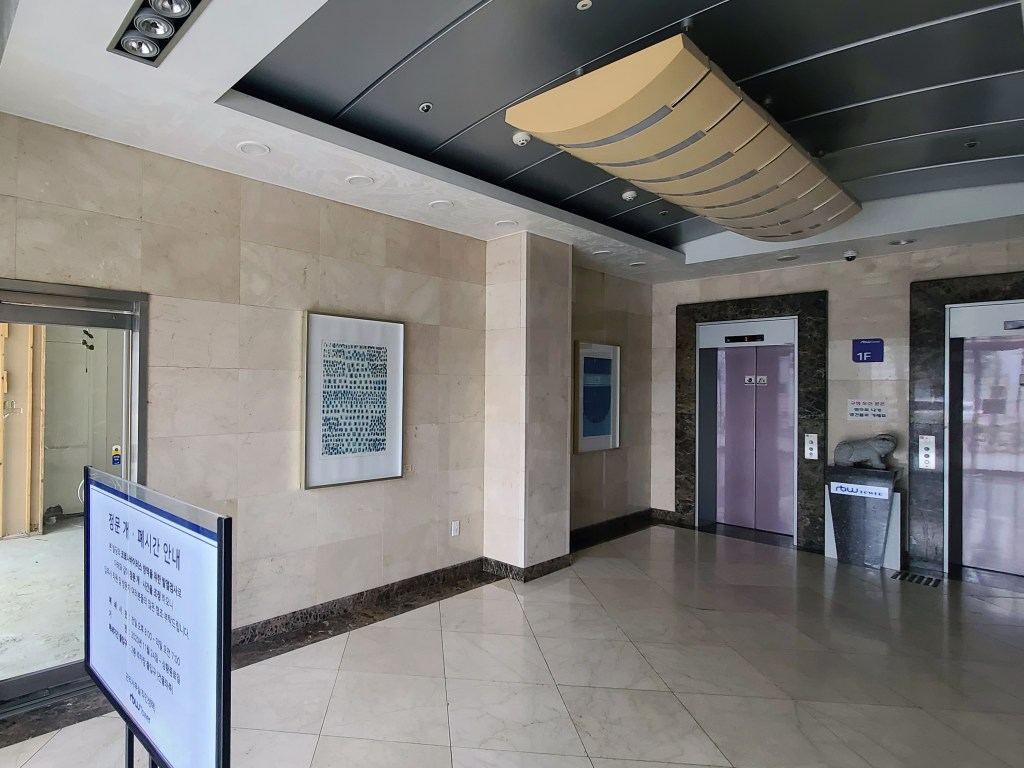 RBW타워는 기존의 장안동 본사에서 이전한 주식회사 알비더블유의 본사이다. 로비의 기존 마감은 천장상부는 알루미늄 오브재이고 바닥과 벽의 마감은 천연대리석이었다. 10년전만 해도 고급스럽고 비싼 자재이었고 그 때는 건축주도 좋아했을거다. 그래서 굳이 돈을 들여서 고치는 것에 대해서 찬성하지 않았고 그렇게 진행하였다. 하지만 카페의 입면이 바뀌고 출입구 파사드의 구조물을 바꾸고 출입구의 형태를 바꾸니 모든 분들이 로비 또한 변경을 해야 한다고 하셔서 최소한의 비용으로 분위기를 맞추고자 진행하였다.