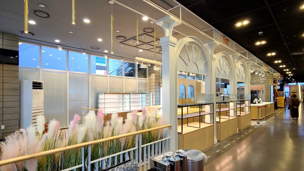 고객에게 보여주고 있었던 것이 부산의 40여년의 명문 제과점으로 보여주기 위해서 고급스럽고 복고풍이 느껴지는 아치와 고딕한 기둥을 조합해서 그 사이에 진열장을 어울리게 배치하였고, 마감재는 깔끔하고 고급스러운 자작합판을 사용하였다.