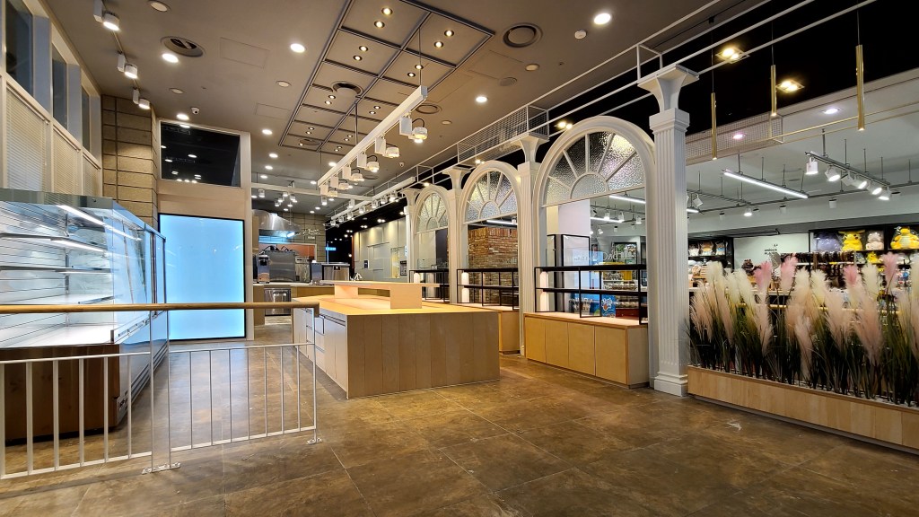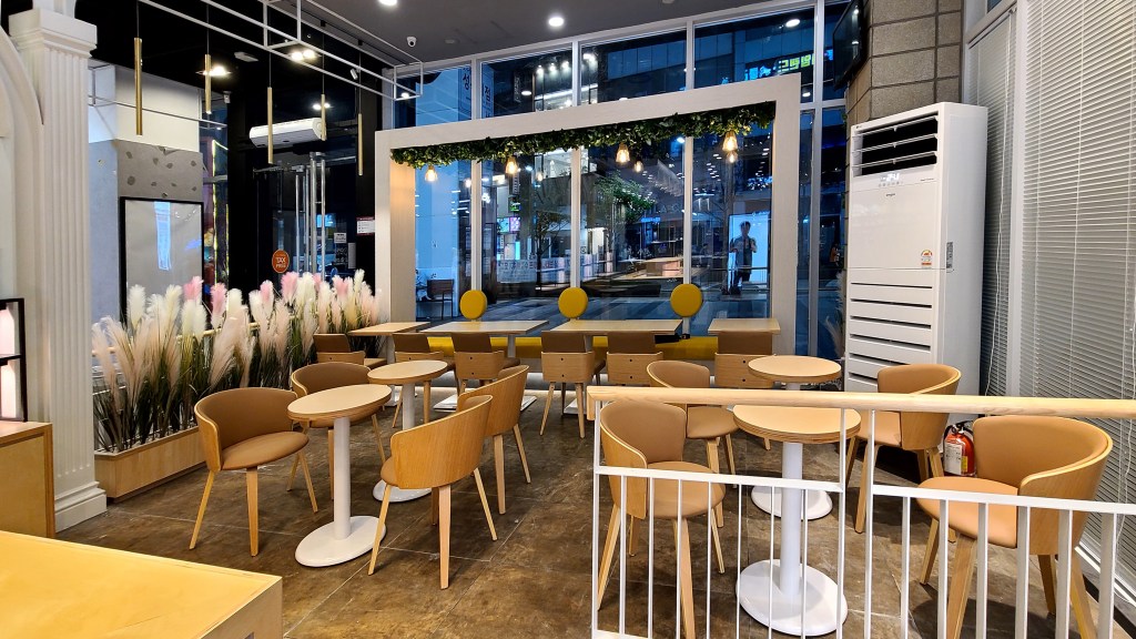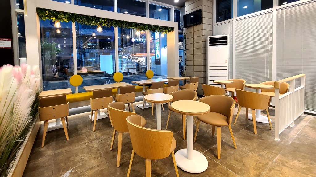 천장은 기존의 컬러를 그레이톤으로 바꾸고 필요없는 오브제를 제거하고 깔끔한 매장으로 변화시켰고 공사기간을 줄이기위해서 천장은 뿜칠보다는 롤러로 칠하였다. 밖에 보이는 경치를 외부에서 차단하여 균일한 조도를 유지하기 위해서 창에는 블라인더를 설치하였다.