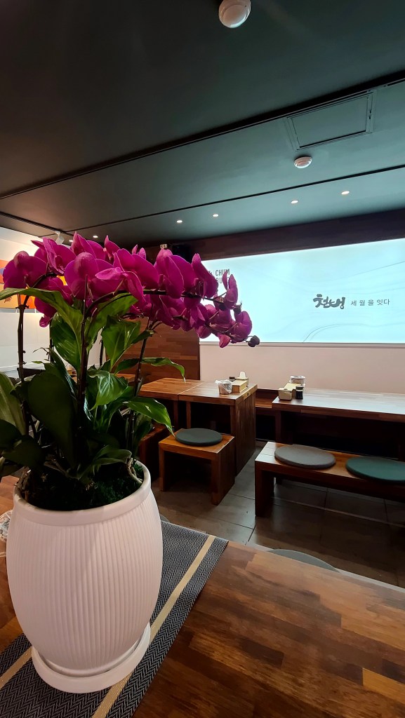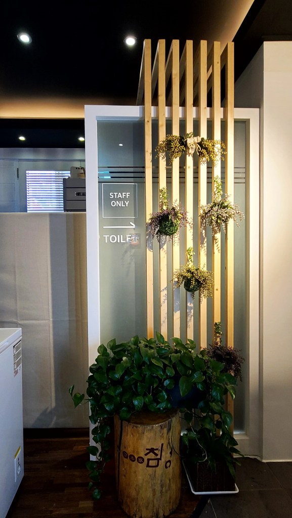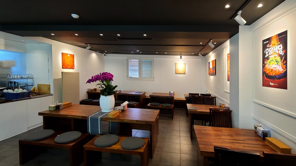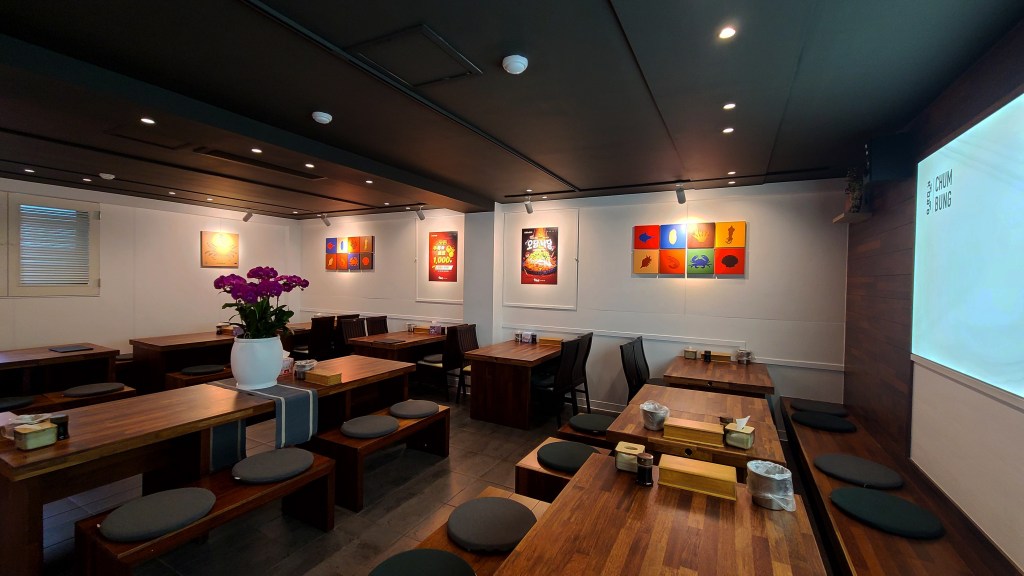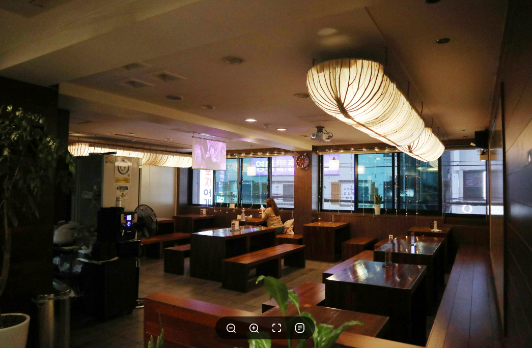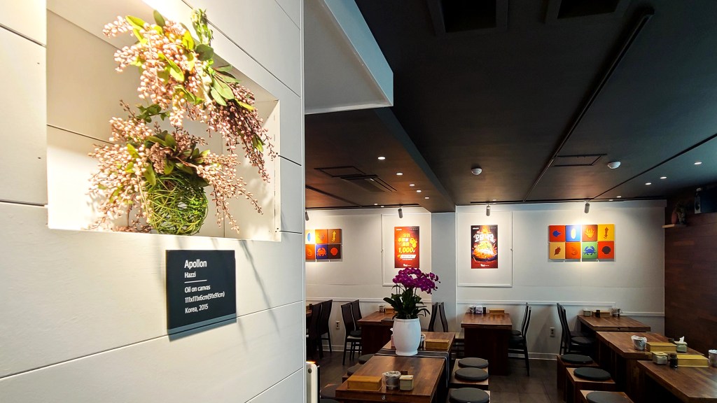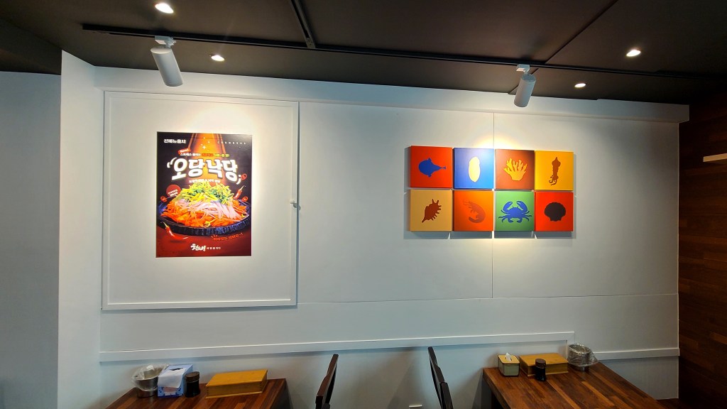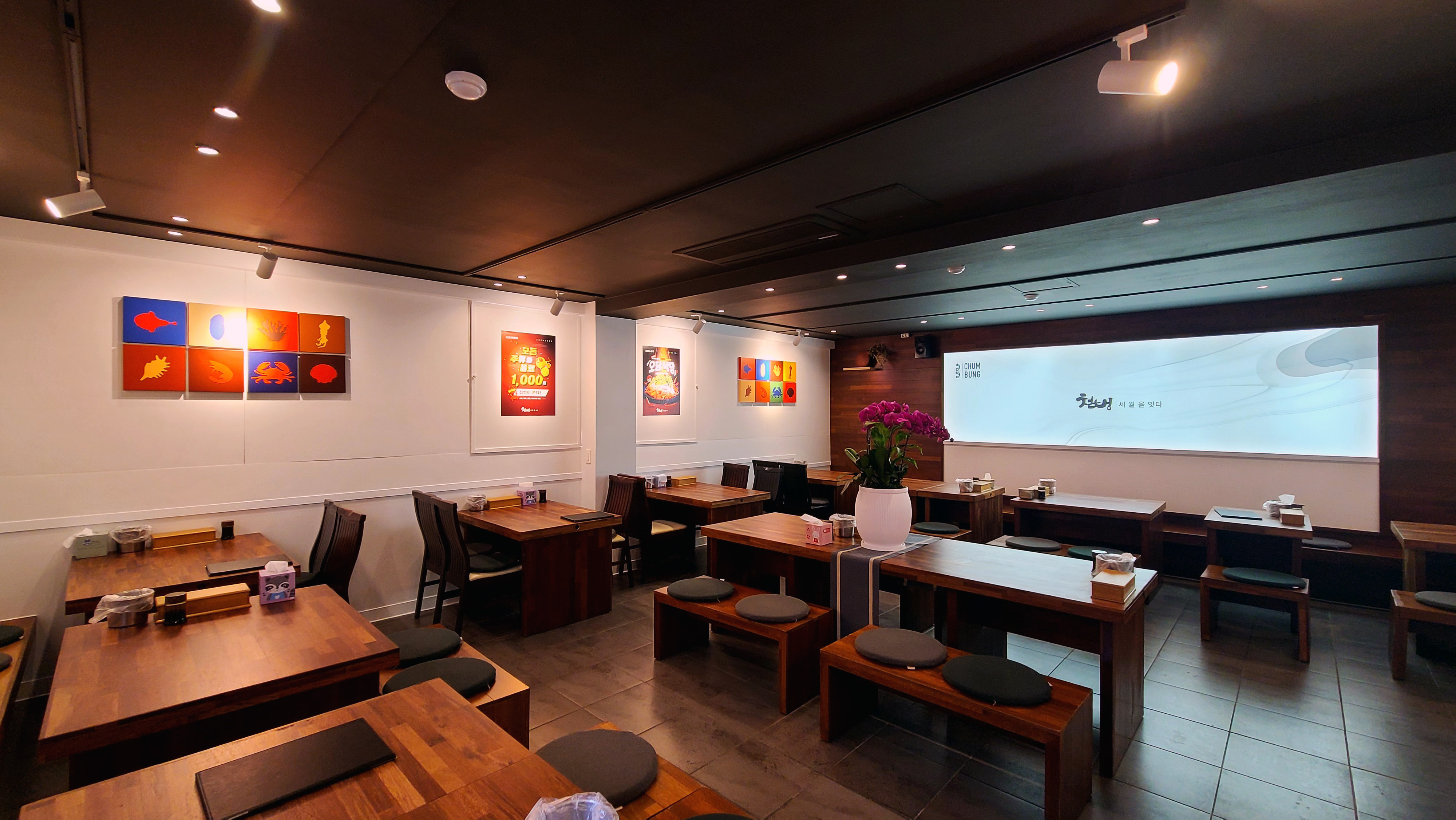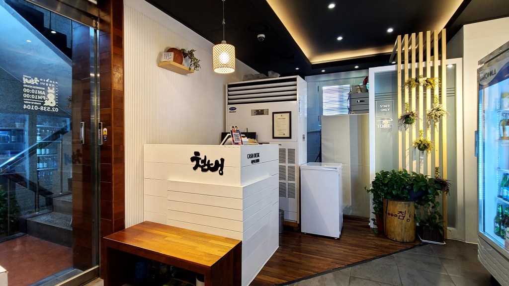 기존의 영업은 봉추찜닭이었다. 디자인방향은 단순하게 진행하였다. 어지러운 천장을 심플하게 하며, 유리창 넘머로 보이는 전주와 고압선을 가리기 위해서 창을 막고, 고객에게 편한한 갤러리를 만들어서 해물전문점 식당이라기 보다는 좋은 음식을 편안히 즐길 수 있는 휴식공간을 만들는데 고객이 동의해주셨다.