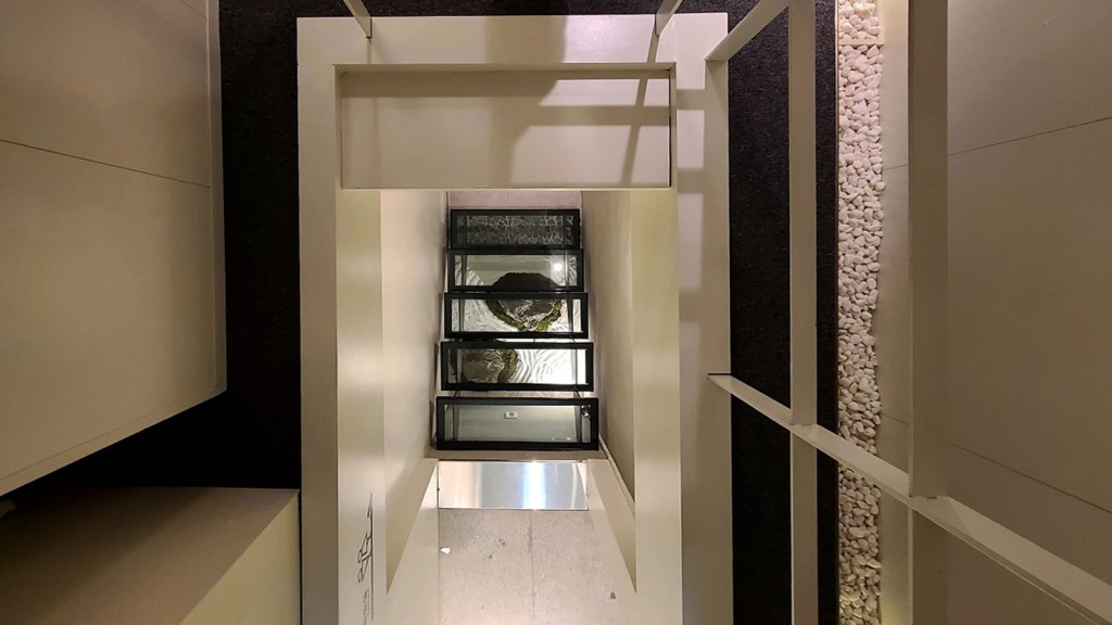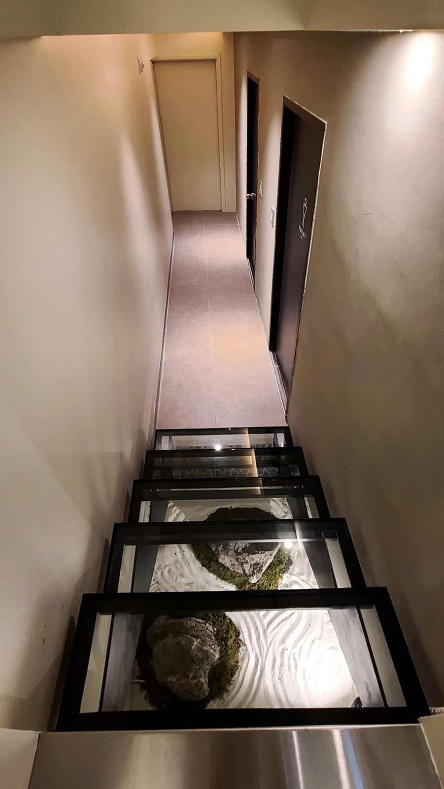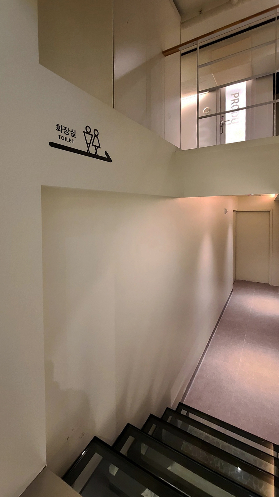 지하실의 단조로운 공간에 재미를 주기 위해서 만든 누드계단이다. 처음에는 내려갈때 걱정스러운 눈으로 벽을 잡으면서 조심스럽게 내려오는 직원들을 보면서 속으로 많이 웃었다. 이 접합유리는 망치를 떨어트려도 깨지지 않는 건축재질이다. 마감재료를 알고 사용하는 숙련된 디자이너만 사용하는 재료이다. 이제는 모두가 웃으면서 잘 지나다닌다.